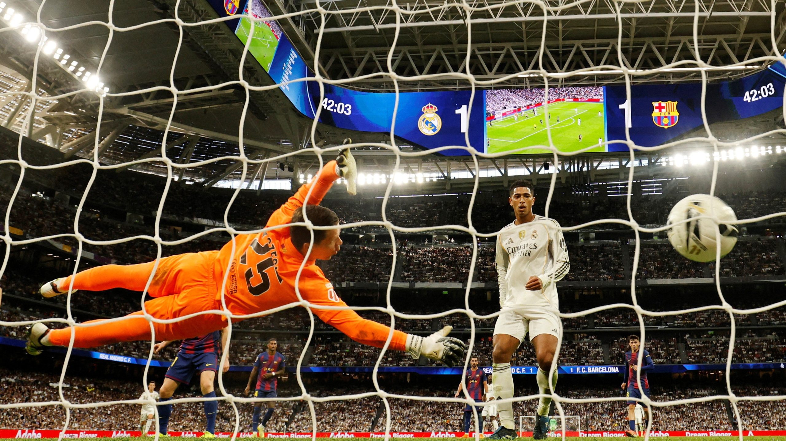 U drugom poluvremenu Barselona je pokušavala da preuzme inicijativu, dok je Real pretio iz kontri. U 52. minutu sudija je dosudio penal zbog igranja rukom Erika Garsije, a Mbape je preuzeo odgovornost. Međutim, Ščensni je odbranio udarac i sačuvao svoj tim. Samo nekoliko sekundi kasnije, Fermin Lopez je promašio priliku za izjednačenje, dok je Jamal i dalje bio neprimetan i daleko od svog standarda.